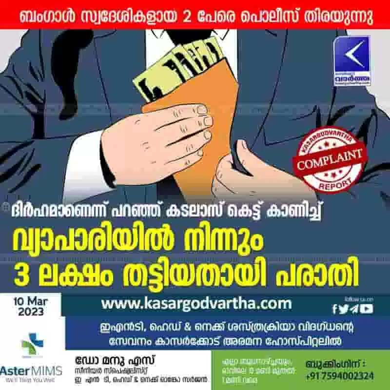 Keywords: Latest-News, Kerala, Kasaragod, Uppala, Top-Headlines, Investigation, Complaint, Crime, Merchant, Fraud, Uppala: Police looking two Bengalis in extorted case. < !- START disable copy paste -->