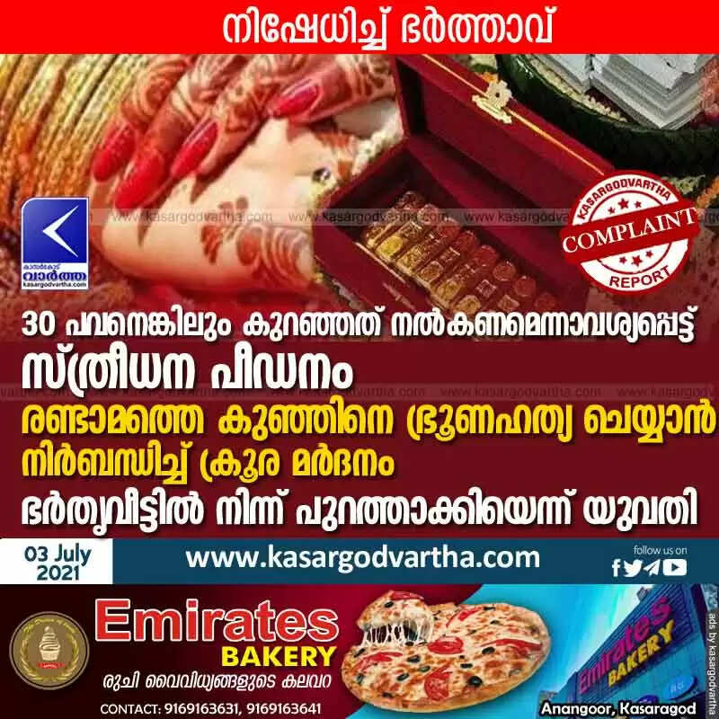 30 പവനെങ്കിലും കുറഞ്ഞത് നല്കണമെന്നാവശ്യപ്പെട്ട് സ്ത്രീധന പീഡനം; രണ്ടാമത്തെ കുഞ്ഞിനെ ഭ്രൂണഹത്യ ചെയ്യാന് നിര്ബന്ധിച്ച് ക്രൂര മര്ദനം, ഭര്തൃവീട്ടില് നിന്ന് പുറത്താക്കിയെന്ന് യുവതി