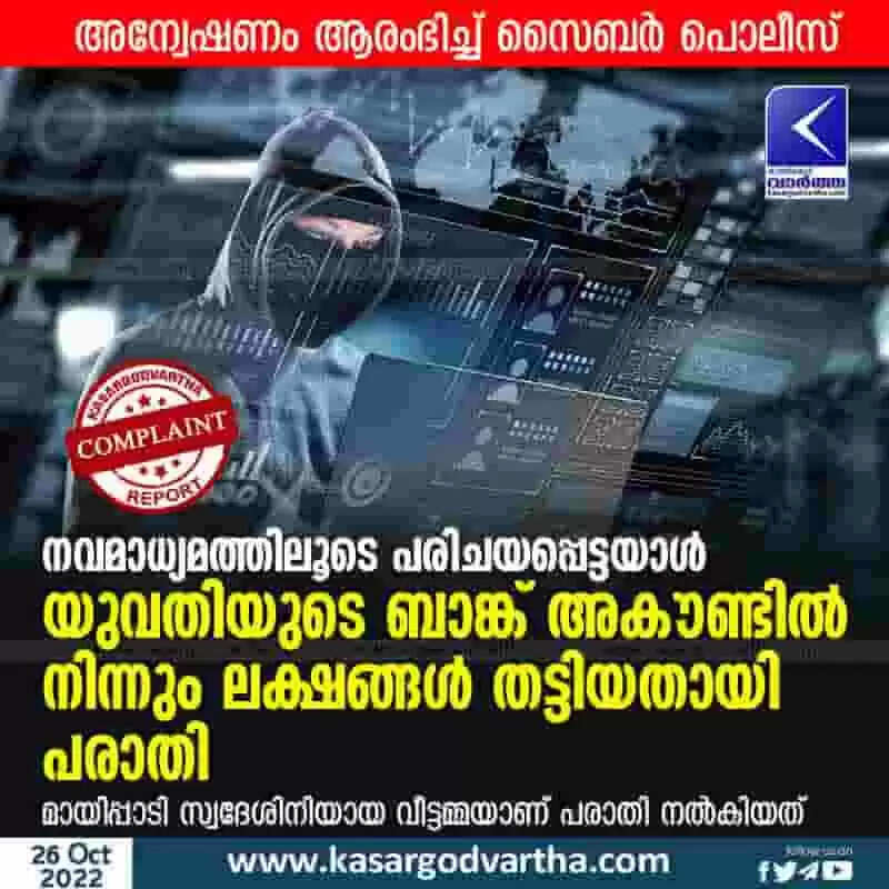 കാസര്കോട്: (www.kasargodvartha.com) നവമാധ്യമത്തിലൂടെ പരിചയപ്പെട്ടയാള് യുവതിയുടെ ബാങ്ക് അകൗണ്ടില് നിന്നും ലക്ഷങ്ങള് തട്ടിയതായി പരാതി. മായിപ്പാടി സ്വദേശിനിയായ 32കാരിയായ വീട്ടമ്മയുടെ പരാതിയില് സൈബര് പൊലീസ് കേസെടുത്ത് അന്വേഷണമാരംഭിച്ചു.