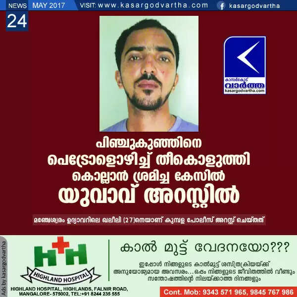 മഞ്ചേശ്വരം: (www.kasargodvartha.com 24/05/2017) പിഞ്ചു കുഞ്ഞിന്റെ ദേഹത്ത് പെട്രോളൊഴിച്ചു തീകൊളുത്തി കൊല്ലാന് ശ്രമിച്ച കേസില് യുവാവ് അറസ്റ്റില്. ഉദ്യാവറിലെ ഖലീലി (27)നെയാണ് കുമ്പള പോലീസ് അറസ്റ്റ് ചെയ്തത്. തിങ്കളാഴ്ച വൈകിട്ട് നാല് മണിയോടെയാണ് നാടിനെ നടുക്കിയ സംഭവം നടന്നത്.