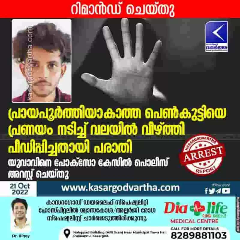 Youth arrested | പ്രായപൂര്ത്തിയാകാത്ത പെണ്കുട്ടിയെ പ്രണയം നടിച്ച് വലയില് വീഴ്ത്തി പീഡിപ്പിച്ചതായി പരാതി; യുവാവിനെ പോക്സോ കേസില് പൊലീസ് അറസ്റ്റ് ചെയ്തു