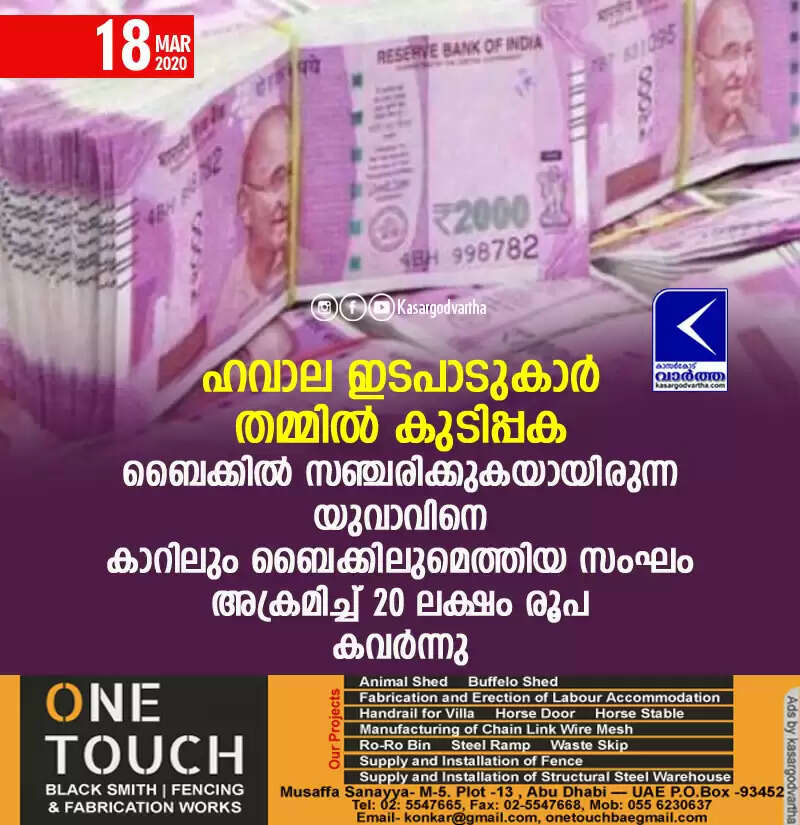 ഹവാല ഇടപാടുകാര് തമ്മില് കുടിപ്പക; ബൈക്കില് സഞ്ചരിക്കുകയായിരുന്ന യുവാവിനെ കാറിലും ബൈക്കിലുമെത്തിയ സംഘം അക്രമിച്ച് 20 ലക്ഷം രൂപ കവര്ന്നു