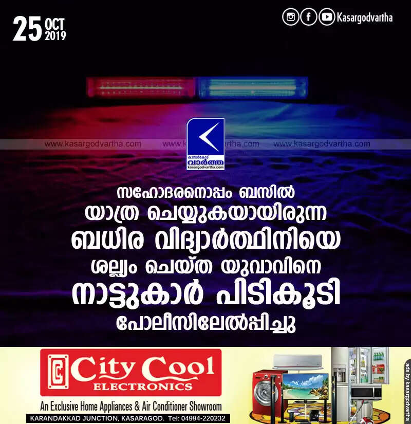 ഉപ്പള: (www.kasargodvartha.com 25.10.2019) സഹോദരനൊപ്പം ബസില്‍ യാത്ര ചെയ്യുകയായിരുന്ന ബധിര വിദ്യാര്‍ത്ഥിനിയെ ശല്ല്യം ചെയ്ത യുവാവിനെ നാട്ടുകാര്‍ പിടികൂടി പോലീസിലേല്‍പ്പിച്ചു. വെള്ളിയാഴ്ച രാവിലെ 8.30 മണിയോടെ ഉപ്പള നയാ ബസാറിലാണ് സംഭവം. ഉപ്പള ബഡാജെയില്‍ നിന്നും ബസ് കയറിയ 18കാരിയായ ബധിര വിദ്യാര്‍ത്ഥിനിയെയാണ് ഒരു യുവാവ് ശല്ല്യം ചെയ്തത്.