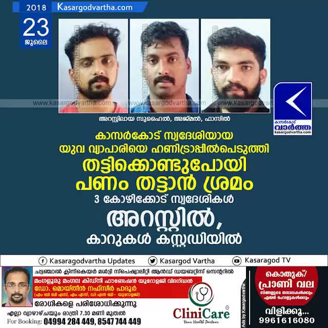 Keywords:  Kasaragod, Kerala, news, Top-Headlines, arrest, Kozhikode, Kidnap, Crime, Youth kidnap by gang; 3 arrested