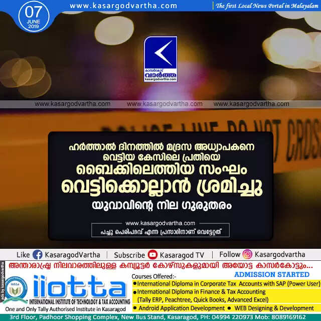 ഹര്ത്താല് ദിനത്തില് മദ്രസ അധ്യാപകനെ വെട്ടിയ കേസിലെ പ്രതിയെ ബൈക്കിലെത്തിയ സംഘം വെട്ടിക്കൊല്ലാന് ശ്രമിച്ചു; യുവാവിന്റെ നില ഗുരുതരം