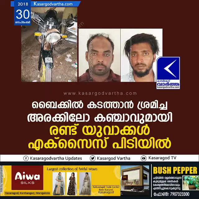 കുമ്പള: (www.kasargodvartha.com 30.09.2018) ബൈക്കില് കടത്താന് ശ്രമിച്ച 550 ഗ്രാം കഞ്ചാവുമായി രണ്ട് യുവാക്കള് എക്സൈസ് പിടിയിലായി. നായ്ക്കാപ്പിലെ നൗഷാദ് (29), മൊഗ്രാല് പെട്ടോരിയിലെ മുനീര് (39) എന്നിവരെയാണ് കുമ്പള എക്സൈസ് സംഘം അറസ്റ്റു ചെയ്തത്. ഇവര് സഞ്ചരിക്കുകയായിരുന്ന ബൈക്ക് എക്സൈസ് കസ്റ്റഡിയിലെടുത്തു.