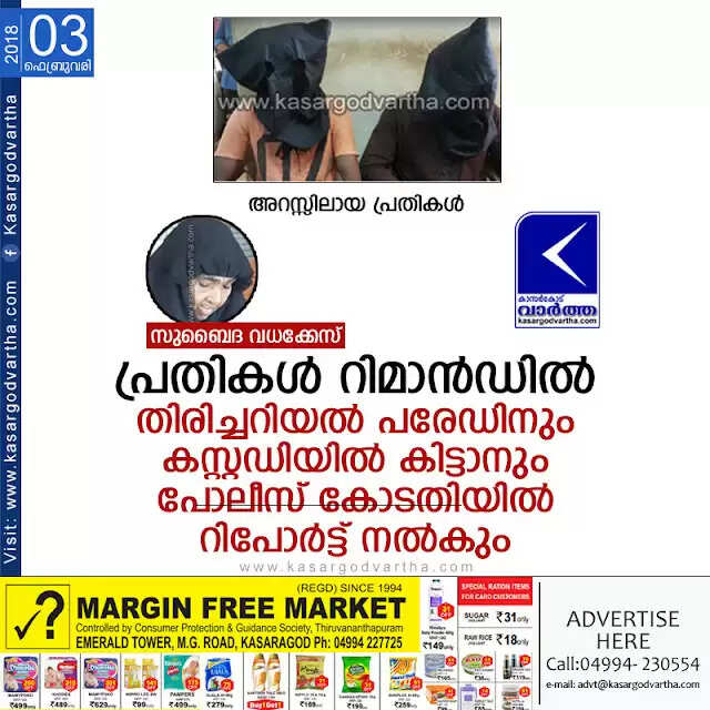 സുബൈദ വധക്കേസ് പ്രതികള് റിമാന്ഡില്; തിരിച്ചറിയല് പരേഡിനും കസ്റ്റഡിയില് കിട്ടാനും പോലീസ് കോടതിയില് റിപോര്ട്ട് നല്കും