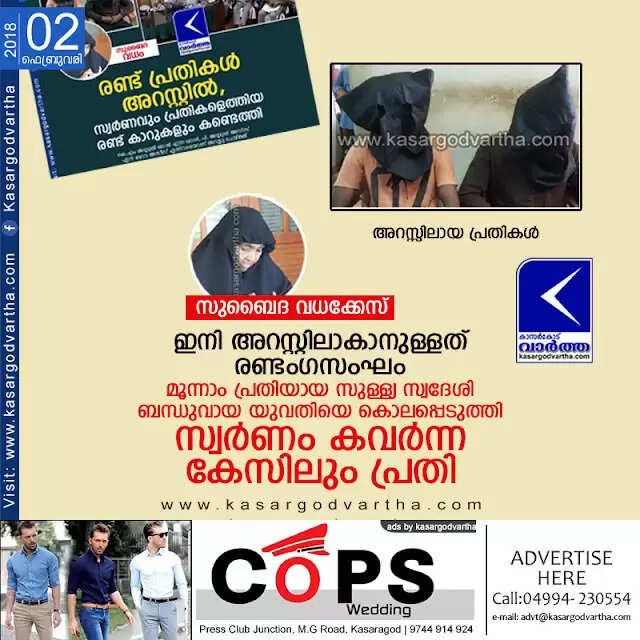 സുബൈദ വധക്കേസില് ഇനി അറസ്റ്റിലാകാനുള്ളത് രണ്ടംഗസംഘം; മൂന്നാം പ്രതിയായ സുള്ള്യ സ്വദേശി ബന്ധുവായ യുവതിയെ കൊലപ്പെടുത്തി സ്വര്ണം കവര്ന്ന കേസിലും പ്രതി