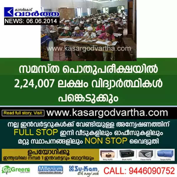 കോഴിക്കോട്: (www.kasargodvartha.com 06.06.2014) സമസ്ത കേരള ഇസ്‌ലാം മത വിദ്യാഭ്യാസ ബോര്‍ഡ് 2014 ജൂണ്‍ 7, 8, 15 തീയ്യതികളില്‍ നടക്കുന്ന പൊതുപരീക്ഷയില്‍ 2,24,007 ലക്ഷം വിദ്യാര്‍ത്ഥികള്‍ പങ്കെടുക്കും. അഞ്ചാം തരത്തില്‍ 6,652 സെന്ററുകളിലായി 58,122 ആണ്‍കുട്ടികളും, 54,828 പെണ്‍കുട്ടികളും, ഏഴാം തരത്തില്‍ 6,017 സെന്ററുകളിലായി 43,486 ആണ്‍കുട്ടികളും, 41,769 പെണ്‍കുട്ടികളും, 10-ാം തരത്തില്‍ 2,877 സെന്ററുകളിലായി 13,073 ആണ്‍കുട്ടികളും, 11,011 പെണ്‍കുട്ടികളും, പ്ലസ്ടു ക്ലാസില്‍ 340 സെന്ററുകളിലായി 1,069 ആണ്‍കുട്ടികളും, 649 പെണ്‍കുട്ടികളുമാണ് പരീക്ഷയെഴുതുന്നത്.