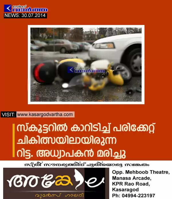സ്കൂട്ടറില് കാറിടിച്ച് പരിക്കേറ്റ് ചികിത്സയിലായിരുന്ന റിട്ട. അധ്യാപകന് മരിച്ചു