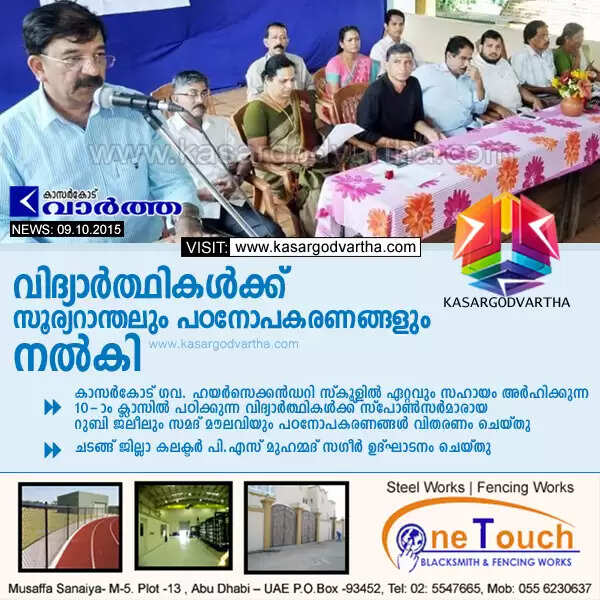 കാസര്കോട്: (www.kasargodvartha.com 09/10/2015) കാസര്കോട് ഗവ. ഹയര്സെക്കന്ഡറി സ്കൂളില് ഏറ്റവും സഹായം അര്ഹിക്കുന്ന 10-ാം ക്ലാസില് പഠിക്കുന്ന വിദ്യാര്ത്ഥികള്ക്ക് സ്പോണ്സര്മാരായ റുബി ജലീലും സമദ് മൗലവിയും പഠനോപകരണങ്ങള് വിതരണം ചെയ്തു. ഗൃഹ പ്രവേശനം നടത്തിയപ്പോള് വൈദ്യുതിയില്ലാതെ നിലത്തിരുന്ന് പഠിക്കുന്ന സുധീഷ് കുമാര്, പ്രവീണ്, കൃഷ്ണ പ്രസാദ്, പ്രജ്വല് എന്നീ കുട്ടികള്ക്കുള്ള സൂര്യറാന്തലും, ജിതിന്ദാസ്, കൃഷ്ണ പ്രസാദ് എന്നീ വിദ്യാര്ത്ഥികള്ക്ക് മേശയും കസേരയും യൂണിഫോമും കൈമാറി.