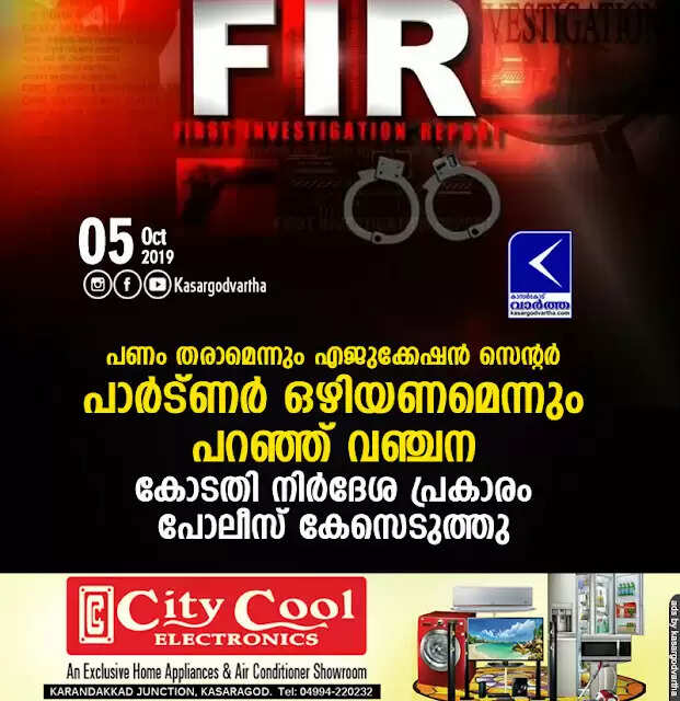 പണം തരാമെന്നും എജുക്കേഷന് സെന്റര് പാര്ട്ണര് ഒഴിയണമെന്നും പറഞ്ഞ് വഞ്ചന; കോടതി നിര്ദേശ പ്രകാരം പോലീസ് കേസെടുത്തു