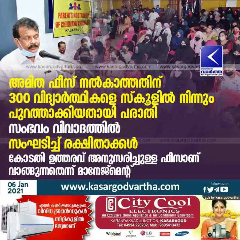 കാസർകോട്: (www.kasargodvartha.com 06.01.2021) അമിത ഫീസ് നൽകാത്തതിന് 300 വിദ്യാർത്ഥികളെ സ്കൂളിൽ നിന്നും പുറത്താക്കിയ സംഭവം വിവാദമായി. നടപടിക്കെതിരെ രക്ഷിതാക്കൾ സംഘടിച്ച് യോഗം ചേർന്ന് ഭാവി പരിപാടികൾ ചർച്ച ചെയ്തു. അതേസമയം ഹൈകോടതി ഉത്തരവ് അനുസരിച്ചുള്ള ഫീസാണ് വാങ്ങുന്നതെന്നാണ് മാനേജ്മെൻ്റിൻ്റെ വിശദീകരണം.