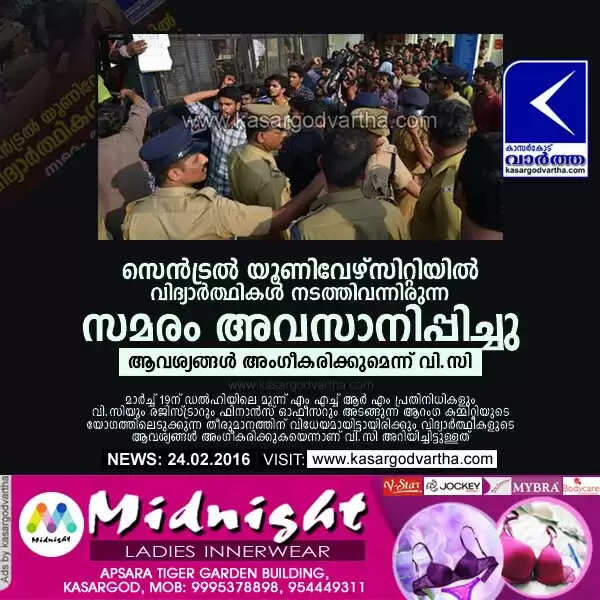 സെന്ട്രല് യൂണിവേഴ്സിറ്റിയില് വിദ്യാര്ത്ഥികള് നടത്തിവന്നിരുന്ന സമരം അവസാനിപ്പിച്ചു; ആവശ്യങ്ങള് അംഗീകരിക്കുമെന്ന് വി.സി
