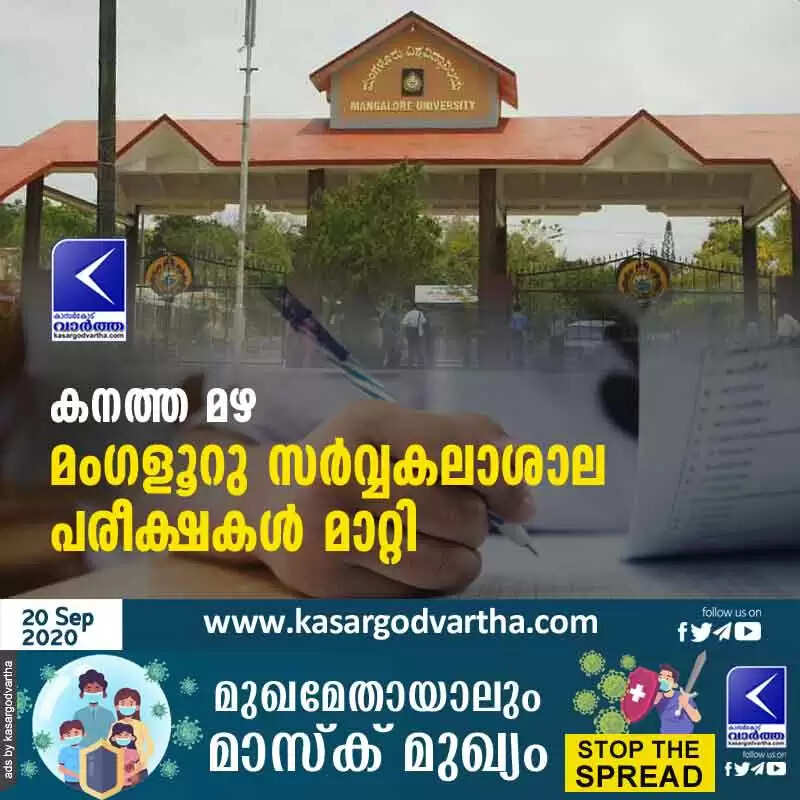 മംഗളൂറു: (www.kasargodvartha.com 20.09.2020) തിങ്കളാഴ്ച ദക്ഷിണ കന്നട, ഉടുപ്പി ജില്ലകളിൽ നടത്താനിരുന്ന മംഗളൂറു സർവ്വകലാശാല പരീക്ഷകൾ മാറ്റിവെച്ചതായി റജിസ്റ്റ്രാർ ഡോ. പി എൽ ധർമ്മ അറിയിച്ചു. കനത്ത മഴ തുടരുന്ന സാഹചര്യത്തിലാണിത്.