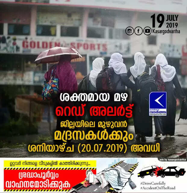 ശക്തമായ മഴ, റെഡ് അലര്ട്ട്: ജില്ലയിലെ മുഴുവന് മദ്രസകള്ക്കും ശനിയാഴ്ച (20.07.2019) അവധി