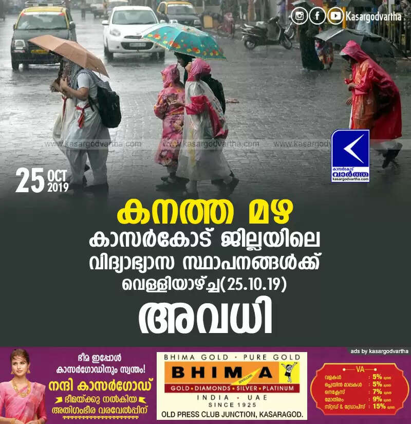 കനത്ത മഴ; കാസര്കോട് ജില്ലയിലെ വിദ്യാഭ്യാസ സ്ഥാപനങ്ങള്ക്ക് വെള്ളിയാഴ്ച്ച(25.10.19) അവധി