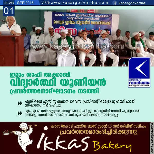 കുമ്പള: (www.kasargodvartha.com 01/09/2016) ഉത്തര മലബാറിലെ അത്യുന്നത മതകലാലയമായ ഇമാം ശാഫി ഇസ്ലാമിക് അക്കാദമിയിലെ വ്യത്യസ്ത സ്ഥാപനങ്ങളിലെ വിദ്യാര്ത്ഥി യൂണിയനുകളുടെ 2016 - 17 വര്ഷത്തെ പ്രവര്ത്തനങ്ങള്ക്ക് തുടക്കമായി. യൂണിയനുകളുടെ സംയുക്തോദ്ഘാടനം എസ് വൈ എസ് സംസ്ഥാന വൈസ് പ്രസിഡന്റ് മെട്രോ മുഹമ്മദ് ഹാജി നിര്വഹിച്ചു.
