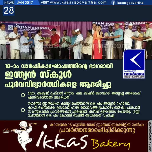 തളങ്കര: (www.kasargodvartha.com 28.01.2017) ഇന്ത്യന്‍ സ്‌കൂളില്‍ നിന്ന് പഠിച്ചിറങ്ങിയ മൂന്ന് വിദ്യാര്‍ത്ഥികളെ ആദരിച്ചു. ഡോ. അബ്ദുര്‍ റഹ് മാന്‍ ഒസാമ, ഷമ്മ ബഷീര്‍ ബാങ്കോട്, അബ്ദുല്ല സുമൈഷ് എന്നിവരെയാണ് സ്‌കൂളിന്റെ 18-ാം വാര്‍ഷികാഘോഷത്തിന്റെ ഭാഗമായി ആദരിച്ചത്.