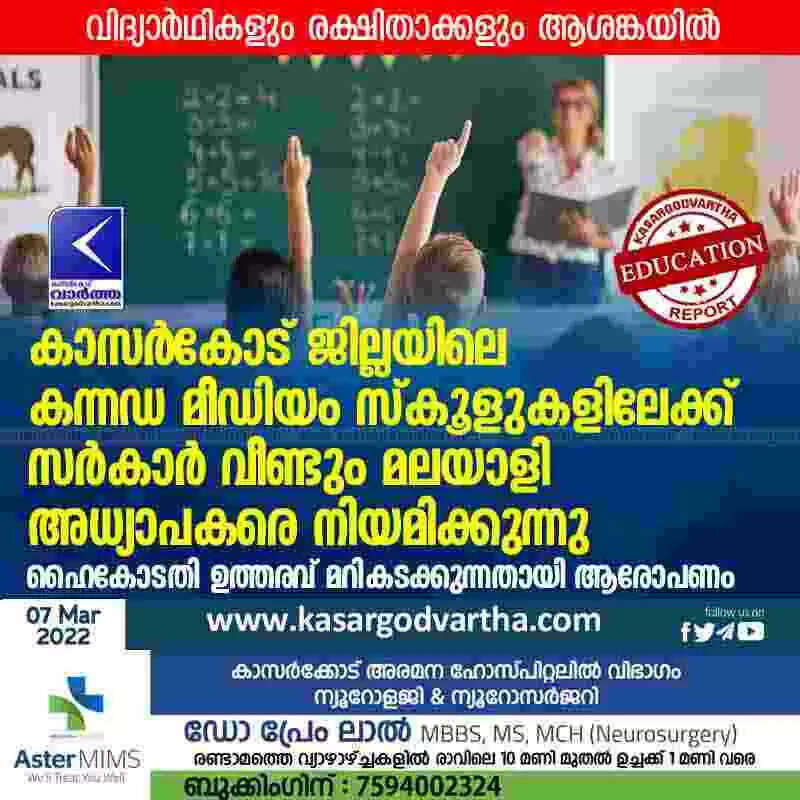 കാസർകോട് ജില്ലയിലെ കന്നഡ മീഡിയം സ്കൂളുകളിലേക്ക് സര്കാര് വീണ്ടും മലയാളി അധ്യാപകരെ നിയമിക്കുന്നു; ഹൈകോടതി ഉത്തരവ് മറികടക്കുന്നതായി ആരോപണം; വിദ്യാര്ഥികളും രക്ഷിതാക്കളും ആശങ്കയില്
