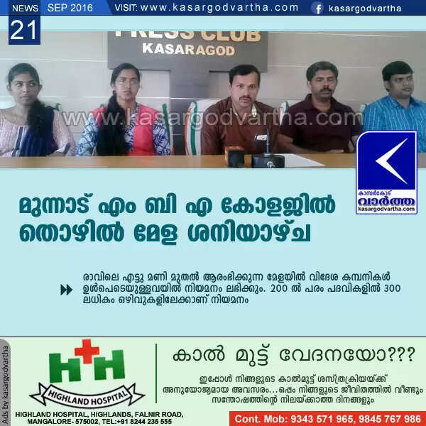 കാസര്‍കോട്: (www.kasargodvartha.com 21/09/2016) മുന്നാട് പീപ്പിള്‍ ഇന്‍സ്റ്റിറ്റിയൂട്ട് ഓഫ് മാനേജ്‌മെന്റ് സ്റ്റഡീസില്‍ ശനിയാഴ്ച തൊഴില്‍ മേള സംഘടിപ്പിക്കുമെന്ന് ബന്ധപ്പെട്ടവര്‍ വാര്‍ത്താ സമ്മേളനത്തില്‍ അറിയിച്ചു. രാവിലെ എട്ടു മണി മുതല്‍ ആരംഭിക്കുന്ന മേളയില്‍ വിദേശ കമ്പനികള്‍ ഉള്‍പെടെയുള്ളവയില്‍ നിയമനം ലഭിക്കും. 200 ല്‍ പരം പദവികളില്‍ 300 ലധികം ഒഴിവുകളിലേക്കാണ് നിയമനം.