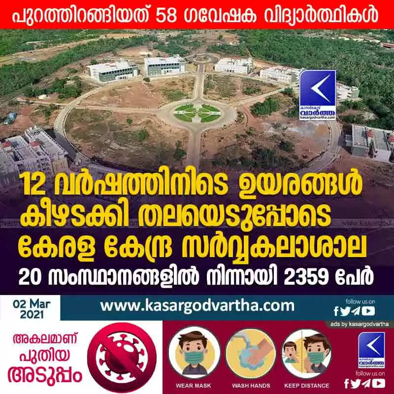 12 വർഷത്തിനിടെ ഉയരങ്ങൾ കീഴടക്കി തലയെടുപ്പോടെ കേരള കേന്ദ്ര സർവ്വകലാശാല; 20 സംസ്ഥാനങ്ങളിൽ നിന്നായി 2359 പേർ; പുറത്തിറങ്ങിയത് 58 ഗവേഷക വിദ്യാർത്ഥികൾ