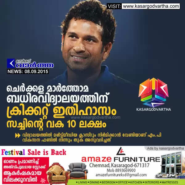 ചെര്ക്കള മാര്ത്തോമ ബധിരവിദ്യാലയത്തിന് ക്രിക്കറ്റ് ഇതിഹാസം സച്ചിന്റെ വക 10 ലക്ഷം