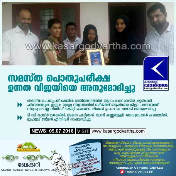 ചട്ടഞ്ചാല്‍: (www.kasargodvartha.com 09/07/2016) സമസ്ത പൊതുപരീക്ഷയില്‍ ദേശീയതലത്തില്‍ ആറാം റാങ്ക് നേടിയ ചട്ടഞ്ചാല്‍ ഹിദായത്തുല്‍ ഇസ്ലാം മദ്രസ്സ വിദ്യാര്‍ത്ഥിനി ഖദീജത്ത് ബുഷ്‌റയെ ജില്ലാ പഞ്ചായത്ത് വിദ്യാഭ്യാസ സ്റ്റാന്‍ഡിംഗ് കമ്മിറ്റി ചെയര്‍പേഴ്‌സണ്‍ ഉപഹാരം നല്‍കി അനുമോദിച്ചു.