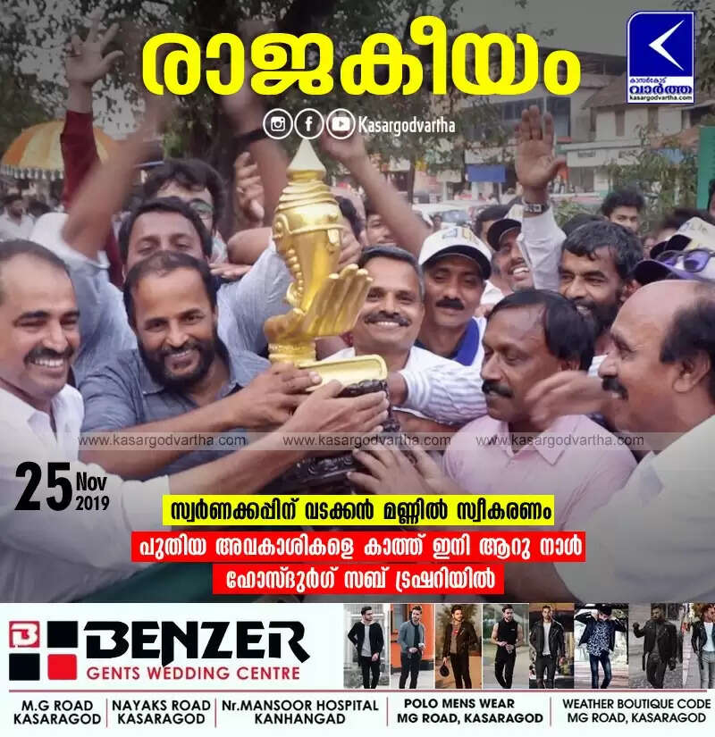 രാജകീയ സ്വീകരണം ഏറ്റുവാങ്ങി സ്വര്‍ണക്കപ്പ് വടക്കന്‍ മണ്ണിലെത്തി; പുതിയ അവകാശികളെ കാത്ത് ആറു നാള്‍ ഹൊസ്ദുര്‍ഗ് സബ് ട്രഷറിയില്‍