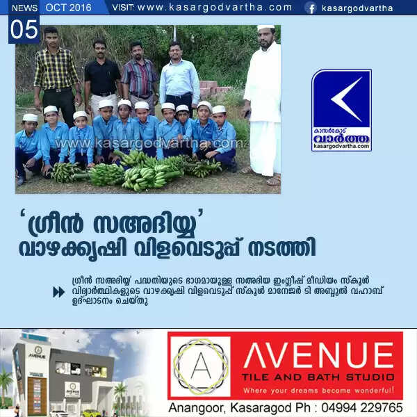 ദേളി: (www.kasargodvartha.com 05/10/2016) 'ഗ്രീന് സഅദിയ്യ' പദ്ധതിയുടെ ഭാഗമായുള്ള സഅദിയ ഇംഗ്ലീഷ് മീഡിയം സ്കൂള് വിദ്യാര്ത്ഥികളുടെ വാഴക്കൃഷി വിളവെടുപ്പ് നടത്തി. ജൈവ വളം മാത്രം ഉപയോഗിച്ച് കുട്ടികള് തന്നെ പരിപാലിച്ചു വന്നിരുന്ന നിരവധി വാഴകളില് നിന്ന് അരഡസനിലധികം കുലകളാണ് വിളവെടുത്തത്.