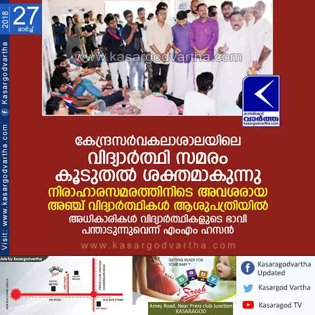 കേന്ദ്രസര്വകലാശാലയിലെ വിദ്യാര്ത്ഥി സമരം കൂടുതല് ശക്തമാകുന്നു; നിരാഹാരസമരത്തിനിടെ അവശരായ അഞ്ച് വിദ്യാര്ത്ഥികള് ആശുപത്രിയില്, അധികാരികള് വിദ്യാര്ത്ഥികളുടെ ഭാവി പന്താടുന്നുവെന്ന് എംഎം ഹസന്