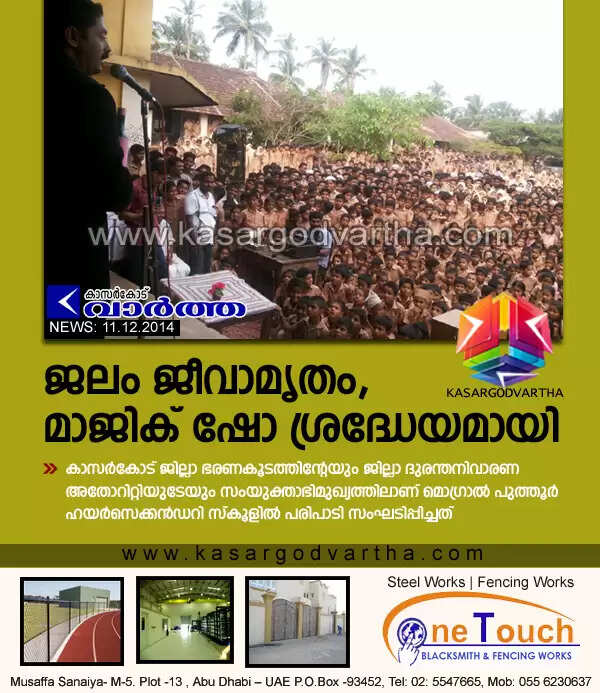 മൊഗ്രാല്‍ പുത്തൂര്‍: (www.kasargodvartha.com 10.12.2014) കാസര്‍കോട് ജില്ലാ ഭരണകൂടവും ജില്ലാ ദുരന്തനിവാരണ അതോറിറ്റിയും സംയുക്തമായി സംഘടിപ്പിച്ച ജലം ജീവാമൃതം മാജിക് ഷോ ശ്രദ്ധേയമായി. പ്രശസ്ത മജീഷ്യന്‍ സുധീര്‍ മാടകത്താണ് മാജിക്കിലൂടെ ജലത്തിന്റെ പ്രാധാന്യത്തെ കുറിച്ച് സന്ദേശവും ആശയവും പകര്‍ന്നത്.