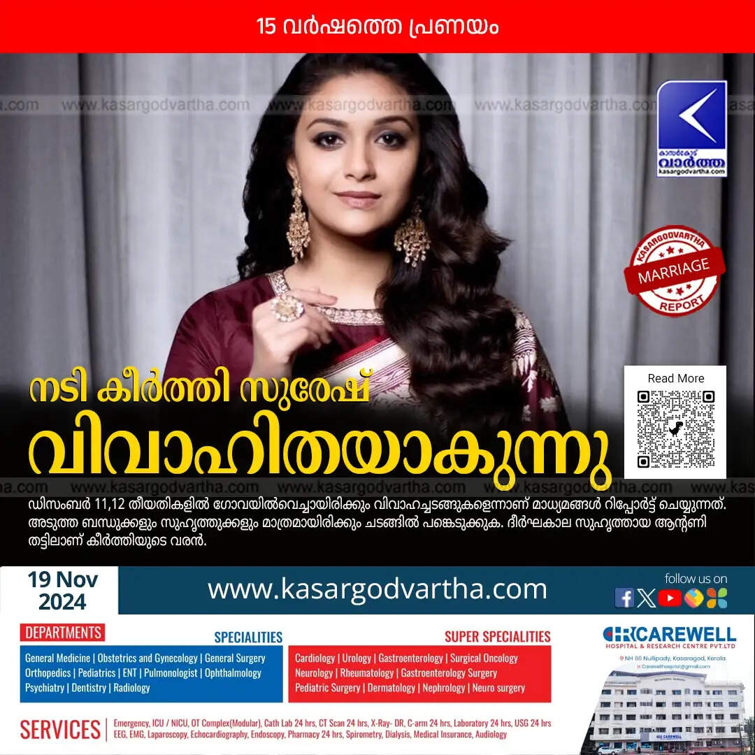 Marriage News | 15 വര്ഷത്തെ പ്രണയത്തിനു ശേഷം നടി കീര്ത്തി സുരേഷ് വിവാഹിതയാകുന്നു?