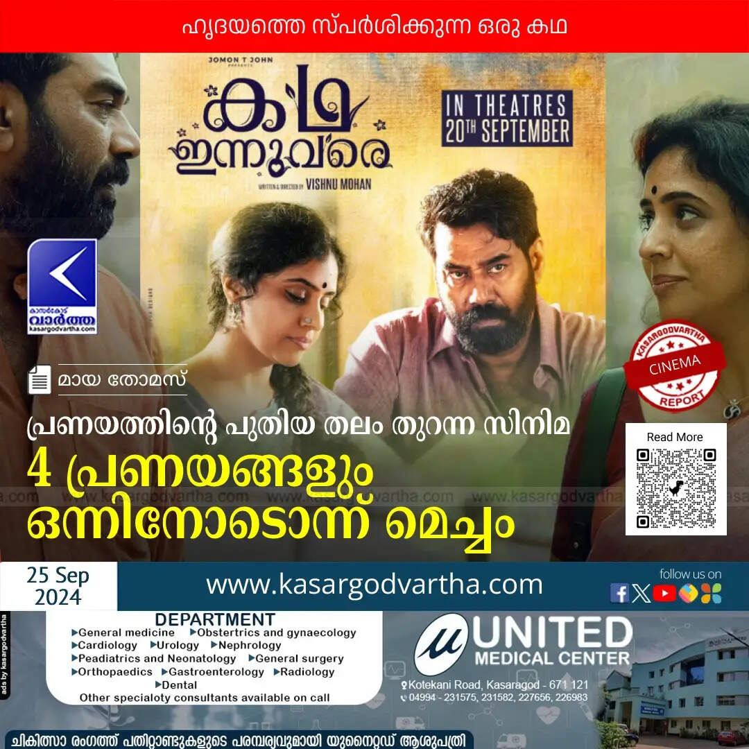 (KasargodVartha) മേപ്പടിയാൻ എന്ന ചിത്രത്തിന് ശേഷം ദേശീയ അവാർഡ് ജേതാവ് വിഷ്ണു മോഹൻ കഥ എഴുതി സംവിധാനം ചെയ്യുന്ന രണ്ടാമത്തെ ചിത്രമായ കഥ ഇന്നുവരെ തീയേറ്ററുകളിൽ കയ്യടി നേടുകയാണ്. മലയാളത്തിലെ ഏറ്റവും മികച്ച ഫീൽഗുഡ് മൂവി എന്ന് തന്നെ പറയാം. തുടക്കം മുതൽ ഒടുക്കം വരെ 4 വ്യത്യസ്തമായ പ്രണയാവിഷ്ക്കാരവും, അതിലൂടെ പ്രണയത്തിന്റെ ഒരു പുതിയ തലം പ്രേഷകരെ ആകർഷിക്കുന്നു. കിടിലൻ സ്ക്രീൻ പ്ലേയും, വേറെ ലെവൽ ലവ് ട്രാക്കുമാണ് ഈ സിനിമയുടെ ഹൈലൈറ്റ്. മേപ്പടിയാൻ ഡയറക്റ്ററിന്റെ പുതുപുത്തൻ കഥാ അവതരണം എന്ന് ഒറ്റവാക്കിൽ ചിത്രത്തെ വിശേഷിപ്പിക്കാം.