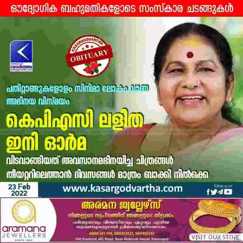 തിരുവനന്തപുരം: (www.kasargodvartha.com 23.02.2022) പതിറ്റാണ്ടുകളോളം സിനിമാ ലോകം വാണ അഭിനയ വിസ്മയം കെപിഎസി ലളിത ഇനി ഓര്മ. ചൊവ്വാഴ്ച രാത്രി കൊച്ചിയിലെ ആശുപത്രിയിലായിരുന്നു കെപിഎസി ലളിതയുടെ അന്ത്യം. അനാരോഗ്യം മൂലം ആശുപത്രിയില് പ്രവേശിപ്പിച്ചിരുന്നു. സംസ്കാരം ബുധനാഴ്ച വൈകീട്ട് വടക്കാഞ്ചേരിയിലെ വീട്ടുവളപ്പില് നടക്കും. ഔദ്യോഗിക ബഹുമതികളോടെയായിരിക്കും സംസ്കാര ചടങ്ങുകള്.