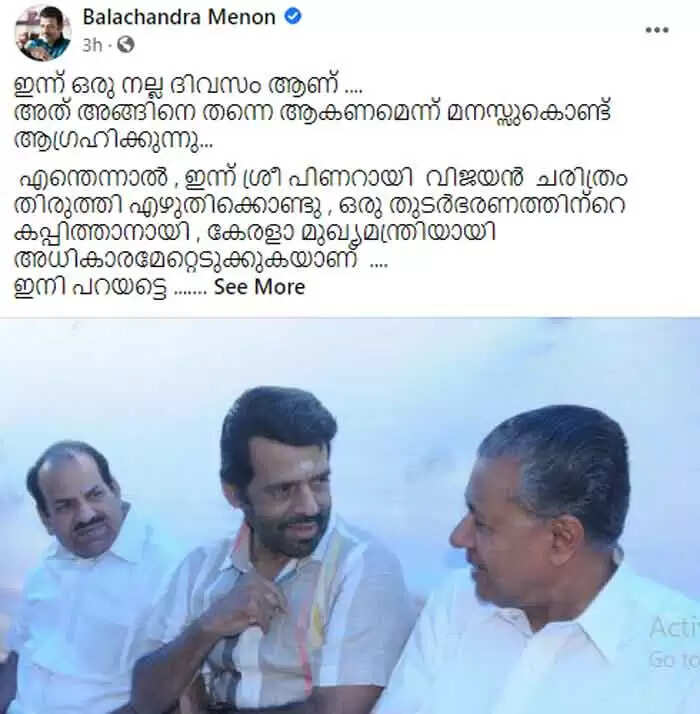 പിണറായി നേടിയ ചരിത്ര വിജയത്തിന്റെ പിന്നിലെ രഹസ്യം എന്തെന്ന് ഇനിയും എത്ര കവടി നിരത്തിയിട്ടും ആര്ക്കും മനസിലാകുന്നില്ല. പക്ഷെ ആരെന്തു പറഞ്ഞാലും എന്തൊക്കെ വ്യഖ്യാനിച്ചാലും ജനാധിപത്യത്തിന്റെ വിജയം ഭൂരിപക്ഷം ആയിരിക്കെ പിണറായി ജേതാവ് തന്നെയാണെന്നും ബാലചന്ദ്ര മേനോന് കുറിച്ചു.