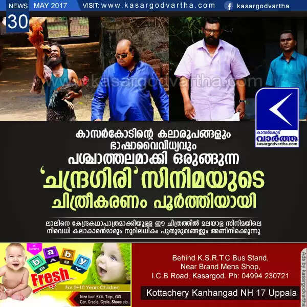 കാസര്കോട്: (www.kasargodvartha.com 30.05.2017) കാസര്കോടിന്റെ പ്രകൃതിയും സാംസ്കാരവും കലാരൂപങ്ങളും ഭാഷാവൈവിധ്യവും പശ്ചാത്തലമാക്കി ഒരുങ്ങുന്ന ചന്ദ്രഗിരി എന്ന സിനിമയുടെ ചിത്രീകരണം പൂര്ത്തിയായി. ലാലിനെ കേന്ദ്രകഥാപാത്രമാക്കിയുള്ള ഈ ചിത്രത്തില് മലയാള സിനിമയിലെ നിരവധി കലാകാരന്മാരും നൂറിലധികം പുതുമുഖങ്ങളും അണിനിരക്കുന്നു.