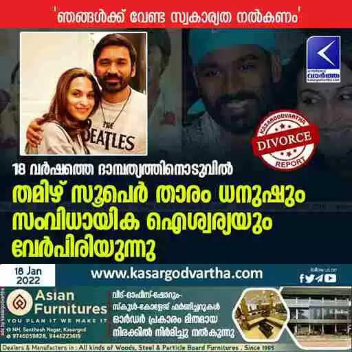 ചെന്നൈ:(www.kasargodvartha.com 18.01.2022) 18 വര്‍ഷത്തെ ദാമ്പത്യത്തിനൊടുവില്‍ തമിഴ് സൂപെര്‍ താരം ധനുഷും സംവിധായിക ഐശ്വര്യ രജനീകാന്തും വിവാഹമോചിതരാകുന്നു. തങ്ങള്‍ വേര്‍പിരിയുന്നുവെന്ന വാര്‍ത്ത ധനുഷാണ് പുറത്തുവിട്ടത്. തിങ്കളാഴ്ച രാത്രിയാണ് താരം ട്വിറ്റെറിലൂടെ അറിയിച്ചത്.