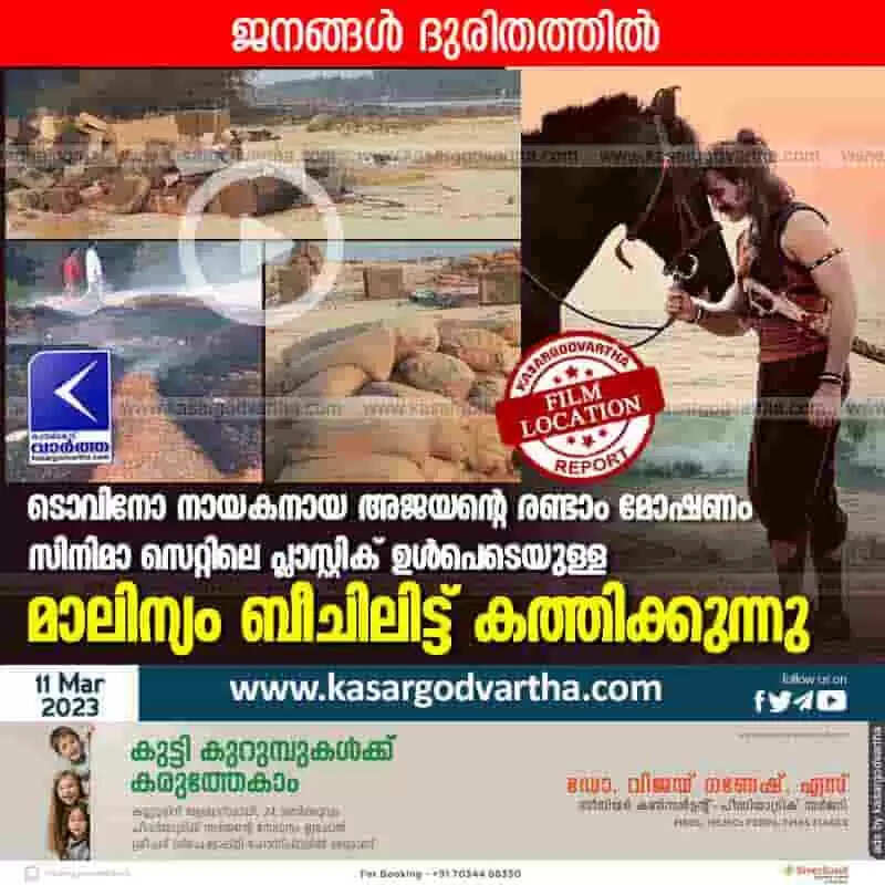 Keywords: Kasaragod, Kerala, News, Top-Headlines, Nileshwaram, Cinema, Film, Plastic, Waste, Fire, Actor, Tovino Thomas, Beach, Ajayante Randam Moshanam, Cinema Shooting, Garbage including plastic from film sets burns on beach.