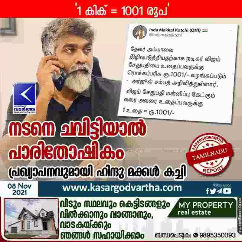 Keywords:  Chennai, Tamilnadu, News, Cine Actor, Politics, Political  Party, Attack, Cash, Laptop, Hindu Makkal Katchi announced reward to whoever kicks Vijay Sethupathi.