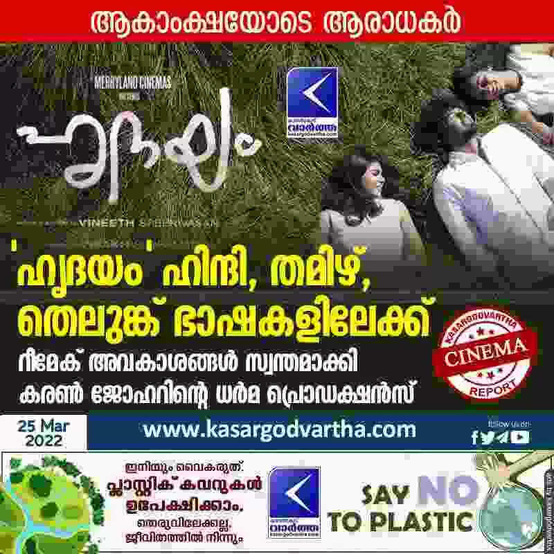 കൊച്ചി: (www.kasargodvartha.com 25.03.2022) ശ്രീനിവാസന്‍ സംവിധാനം ചെയ്ത, പ്രണവ് മോഹന്‍ലാല്‍ നായകനായി എത്തിയ ചിത്രം 'ഹൃദയം' ഹിന്ദി, തെലുങ്ക്, തമിഴ് ഭാഷകളിലേക്ക് റീമേക് ചെയ്യാനൊരുങ്ങുകയാണ്. സിനിമയുടെ റീമേക് അവകാശങ്ങള്‍ കരണ്‍ ജോഹറിന്റെ ധര്‍മ പ്രൊഡക്ഷന്‍സും ഫോക്‌സ് സ്റ്റാര്‍ സ്റ്റുഡിയോസും ചേര്‍ന്ന് സ്വന്തമാക്കി. ഹൃദയത്തിന്റെ നിര്‍മ്മാതാവായ വിശാഖ് സുബ്രഹ്‌മണ്യമാണ് ഇക്കാര്യം സമൂഹമാധ്യമത്തിലൂടെ അറിയിച്ചത്. കരണ്‍ ജോഹറും ഈ വിവരം ട്വിറ്ററിലൂടെ പങ്കുവച്ചു.