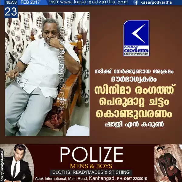 കാസര്‍കോട്: (www.kasargodvartha.com 23/02/2017) കൊച്ചിയില്‍ പ്രമുഖ നടിക്ക് നേരേയുണ്ടായ അക്രമം അങ്ങേയറ്റം ദൗര്‍ഭാഗ്യകരമാണെന്നും ഇത്തരം സംഭവങ്ങള്‍ തടയാന്‍ സിനിമാരംഗത്ത് പെരുമാറ്റ ചട്ടംകൊണ്ടുവരണമെന്നും പ്രമുഖ ചലചിത്ര സംവിധായകനും ചലചിത്ര അക്കാദമി മുന്‍ അധ്യക്ഷനുമായ ഷാജി എന്‍ കരുണ്‍ ആവശ്യപ്പെട്ടു. കാസര്‍കോട് ഗസ്റ്റ് ഹൗസില്‍ മാധ്യമ പ്രവര്‍ത്തകരോട് സംസാരിക്കുകയായിരുന്നു അദ്ദേഹം.