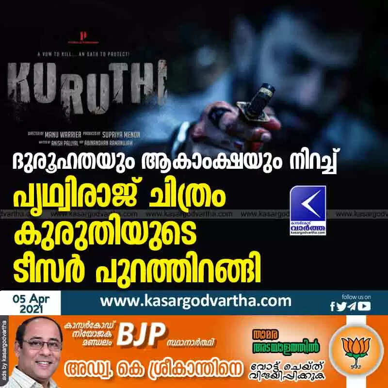 Keywords: Kochi, News, Kerala, Top-Headlines, Cinema, Entertainment, Actor, Video, Teaser of Prithviraj movie Kuruthi released full of mystery and curiosity
