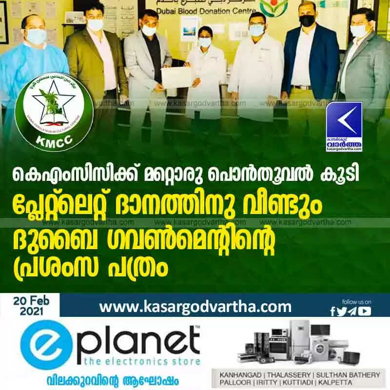 കെഎംസിസിക്ക് മറ്റൊരു പൊൻതൂവൽ കൂടി; പ്ലേറ്റ്ലെറ്റ് ദാനത്തിനു വീണ്ടും ദുബൈ ഗവൺമെന്റിന്റെ പ്രശംസ പത്രം