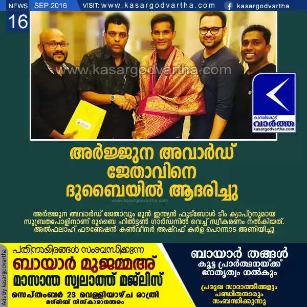 ദുബൈ: (www.kasargodvartha.com 16/09/2016) ഈ വര്‍ഷത്തെ കേന്ദ്ര ഗവണ്‍മെന്റിന്റെ അര്‍ജ്ജുന അവാര്‍ഡ് ജേതാവും മുന്‍ ഇന്ത്യന്‍ ഫുട്‌ബോള്‍ ടീം ക്യാപ്റ്റനുമായ ഒരു പതിറ്റാണ്ട് കാലമായി ചോരാത്ത കൈകളുമായി ഇന്ത്യന്‍ ഗോള്‍ വലയം കാക്കുന്ന സുബ്രതപോളിന് ദുബൈ ഹില്‍ട്ടണ്‍ ഗാര്‍ഡനില്‍ വെച്ച് സ്വീകരണം നല്‍കി.