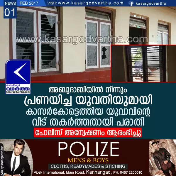 അബുദാബിയില് നിന്നും പ്രണയിച്ച യുവതിയുമായി കാസര്കോട്ടെത്തിയ യുവാവിന്റെ വീട് തകര്ത്തതായി പരാതി; പോലീസ് അന്വേഷണം ആരംഭിച്ചു