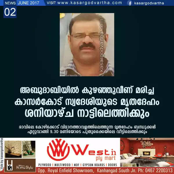 അബുദാബിയില് കുഴഞ്ഞുവീണ് മരിച്ച കാസര്കോട് സ്വദേശിയുടെ മൃതദേഹം ശനിയാഴ്ച നാട്ടിലെത്തിക്കും