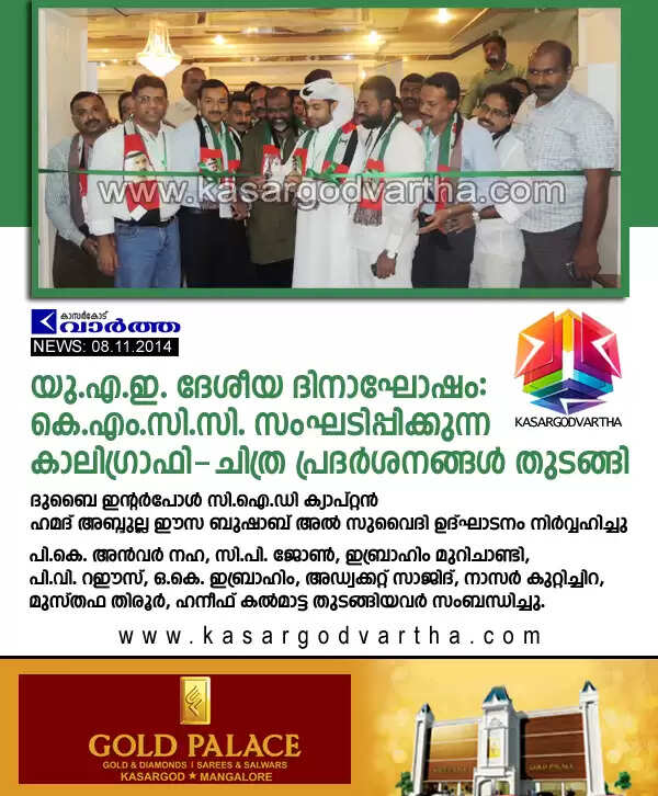 ദുബൈ: (www.kasargodvartha.com 08.11.2014) ദുബൈ കെ.എം.സി.സി, യു.എ.ഇ 43-ാം ദേശീയ ദിനത്തോടനുബന്ധിച്ചു സംഘടിപ്പിക്കുന്ന ഒരുമാസം നീണ്ടു നില്ക്കുന്ന പരിപാടികള്ക്ക് തുടക്കമായി. അല് ബറാഹ കെ.എം.സി.സി ആസ്ഥാനത്ത് തുടങ്ങിയ കാലിഗ്രാഫിയുടെയും, ചിത്രങ്ങളുടെയും പ്രദര്ശനത്തിന്റെ ഉദ്ഘാടനം ദുബൈ ഇന്റര്പോള് സി.ഐ.ഡി ക്യാപ്റ്റന് ഹമദ് അബ്ദുല്ല ഈസ ബുഷാബ് അല് സുവൈദി നിര്വ്വഹിച്ചു.