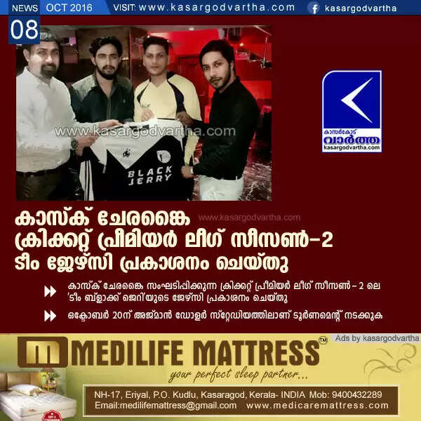 ദുബൈ: (www.kasargodvartha.com 08/10/2016) കാസ്ക് ചേരങ്കൈ സംഘടിപ്പിക്കുന്ന ക്രിക്കറ്റ് പ്രീമിയര് ലീഗ് സീസണ്-2 ലെ 'ടീം ബ്ളാക്ക് ജെറി'യുടെ ജേഴ്സി പ്രകാശനം ചെയ്തു. ഒക്ടോബര് 20ന് അജ്മാന് ഡോളര് സ്റ്റേഡിയത്തിലാണ് ടൂര്ണമെന്റ് നടക്കുക.