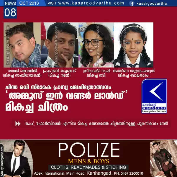 അബുദാബി: (www.kasargodvartha.com 08/10/2016) അബുദാബി കേരള സോഷ്യല് സെന്ററിന്റെ ആഭിമുഖ്യത്തില് സംഘടിപ്പിച്ച നാലാമത് ചിന്ത രവി സ്മാരക ഹ്രസ്വ ചലചിത്രോത്സവത്തില് മികച്ച ചിത്രമായി 'അമ്മൂസ് ഇന് വണ്ടര് ലാന്ഡ് ' തെരഞ്ഞെടുക്കപ്പെട്ടു. 'ഒപ്പം', 'ഫോര്ബിഡന്' എന്നിവ മികച്ച രണ്ടാമത്തെ ചിത്രത്തിനുള്ള പുരസ്കാരം നേടി.